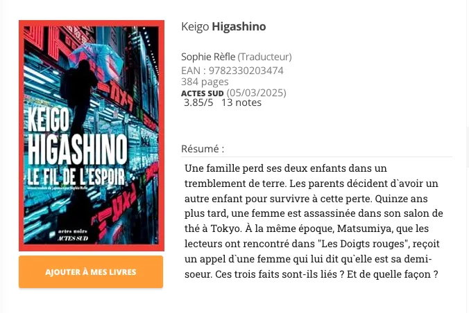 KOJI KITAI's photograph was adopted for the cover of the French edition of Keigo Higashino's [A Thread of Hope]!